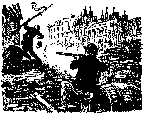 Капораль решил, что успеет дать сигнал своим раньше, чем ошеломлённый мальчик придёт в себя. Наколов на штык белую повязку, он стремительно вскочил на бочку и затем на самый верх баррикады. Размахивая самодельным белым флагом, он крикнул: