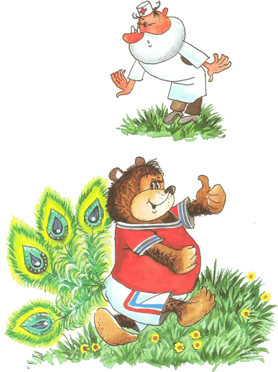 Но с улыбкою глядитНа медведя Айболит:«И куда тебе в павлины!Ты возьми себе козлиный!»«Не желаю я хвостовОт баранов и котов!Подавай-ка мне павлиний,Золотой, зеленый, синий,Чтоб я по лесу гулял,Красотою щеголял!»