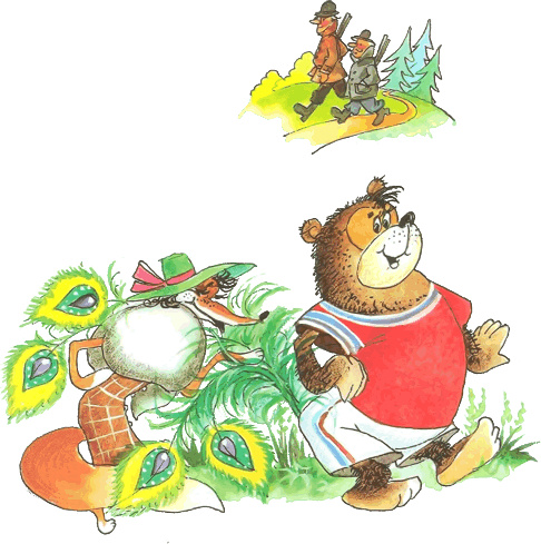 Но тут по болоту охотники шлиИ Мишенькин хвост увидали вдали. «Глядите: откуда такое В болоте блестит золотое?» Поскакали по кочкам вприпрыжку, И увидели глупого Мишку. Перед лужею Мишка сидит, Словно в зеркало, в лужу глядит,Все хвостом своим, глупый, любуется,Перед Лисонькой, глупый, красуетсяИ не видит, не слышит охотников,Что бегут по болоту с собаками.