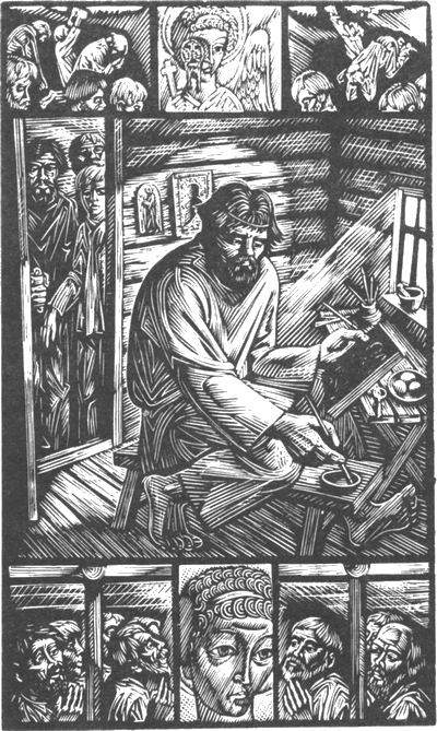 И опять как бы в ответ Глазунову — два листа П. Пинкисевича в пятитомнике 1981 года: там благообразная прописанность — здесь грубоватая небрежность, там чарующая лесная зелень — здесь раздражающая кирпичная краснота стены, там кроткий Памва с вязаночкой дров — здесь развесистый Марой с ломом и веревкой. Как ответ небезынтересно, но как версия — невнятно, да и мало.