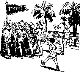 Саша-Аркаша назначил. Рядом с флаговым Вадимом. Вадим несёт флажок, на котором написано: «Первый отряд», а Коля шагает рядом. И ничуть не хуже у него получается. Главное — правильно размахивать в длину ногами. И он размахивает. И руками правильно размахивать, но только в ширину. И он размахивает.
