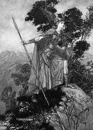 Дикие горы и скалы. В глубине сцены снизу подымается ущелье, сверху оканчиваясь высоким хребтом; в направлении авансцены почва, начиная с уклона этого хребта, снова понижается. Вотан, в боевом вооружении, с копьем в руке; перед ним — Брунгильда, в образе Валькирии, тоже в полном вооружении.