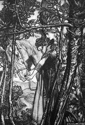 Она медленно направляется в глубину сцены. — Поднявшись на горный хребет и заглянув вниз. в ущелье, Брунгильда видит приближающихся Зигмунда и Зиглинду; она смотрит на них несколько мгновений. затем направляется в пещеру к своему коню, совершенно исчезая, таким образом. из глаз зрителя.