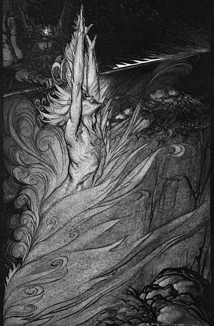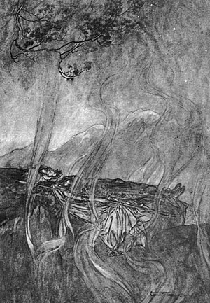 Медленно отходя, Вотан еще раз горестно оглядывается. Наконец он торжественно и решительно идет на средину сцены и направляет острие своего копья на большой скалистый камень.