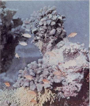 С вершины Грейт-Метеора фотокамера принесла виды плато, покрытого невысокими густыми зарослями: кремневые губки, раковины, карликовые кораллы. Теория опускания островов подтверждается тем, что поблизости есть подводная гора Йер примерно такой же высоты. Ее вершина оказалась размытой до коренной породы. Сани прошли над трещинами, набитыми крупной рыбой. Однако было бы неверно судить по этому о всей горе. Когда мы опустили сани и драги ниже, выяснилось, что на склонах есть богатая, разнообразная жизнь. На восточном и западном склонах — поля белых и желтых кремневых губок, растущих на помеченном тут и там рябью белом песчаном грунте. Южный склон сложен черным вулканическим шлаком, напоминающим металлургический. Редкие высокие горгонарии оживляли этот угрюмый ландшафт. Резкие геологические и биологические контрасты на сравнительно небольших участках подводного мира оказались главной неожиданностью, которую принесли нам санные операции.