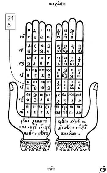 Что касается названной выше второй ошибки, то ее учесть проще, хотя она приводит к большему количеству вариантов. Как мы уже сказали, круг Солнцу мог указываться по перстам руки Дамаскиновой, см. рис. 1.33. Например, вместо круга Солнцу 21 могли писать: «5 на среднем персте» (иногда его именовали «великим перстом», поскольку он самый длинный). В самом деле, обратившись к рис. 1.33, мы видим, что «пятое вруцелето на среднем персте» соответствует «кругу Солнцу 21», см. рис. 1.37.