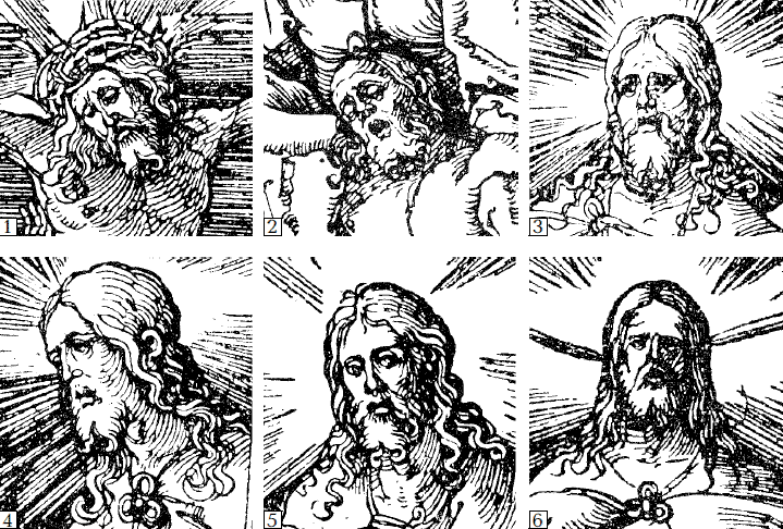 Рис. 2.27. Раздвоенная борода Христа. Фрагменты гравюр Альбрехта Дюрера. № 1 – «Распятие». Взято из [171], им. 246. № 2 – «Снятие с креста». Взято из [171], им. 249. № 3 – «Восстание из гроба». Взято из [171], им. 251. № 4 – «Явление Христа Богоматери». Взято из [171], илл. 252. № 5 – «Христос с учениками». Взято из [171], илл. 254. № 6 – «Страшный Суд». Взято из [171], илл. 258.