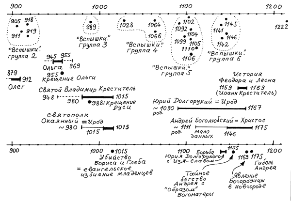 Рис. 3.13. Хронологическая схема некоторых узловых событий, связанных со Святополком Окаянным, Борисом и Глебом, Андреем Боголюбским, Юрием (Георгием) Долгоруким и Святым Владимиром Крестителем.