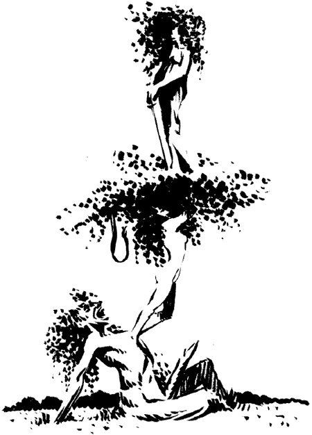 Вот, что называется, ветви одного дерева! Одна из ветвей корявая и забавная, напоминает мужчину с изумленным лицом, с раскинутыми руками и ногами, с торчащим членом в виде сучка. Из области грудной клетки от него отходит другая ветвь — нежная, приятных очертаний, похожая на обнаженную девушку с протянутой рукой. «Девушка» словно бы тянется к румяному яблочку, которое рдеет в изумрудной листве, но дотянуться не может. К уху «девушки» из глубины кроны склонилась еще одна ветка — тонкая, извивающаяся и безлиственная, похожая на змею, что-то нашептывающую своим рассеченным язычком. Ну, и конечно же, над всем этим громоздится самая роскошная из ветвей, грозная и пышная, похожая на ангела с мечом. Ну вот, как говорится, каково дерево, таковы и ветви! О-хо-хо!