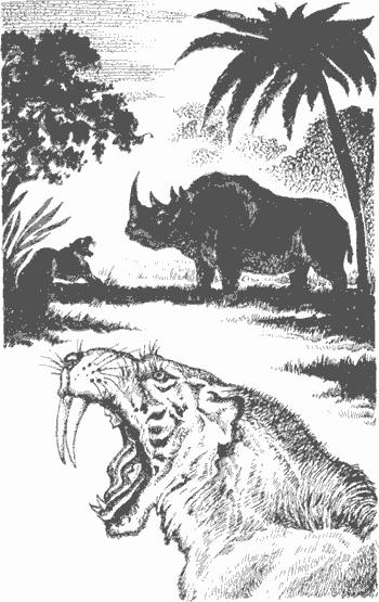 Но вдруг из леса послышался шум. Хищники насторожились. Между деревьев показалась туша носорога. Махайроды бросились к нему и окружили со всех сторон. Носорог издал глухой рев, нагнул голову и ринулся на ближайшего из хищников. Тот отскочил в сторону, а в это время две пары клыков разорвали шкуру носорога.
