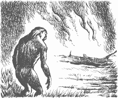 Вот Ра подошел совсем близко – и обмер от страха и удивления. Посреди поляны лежало большое, расщепленное молнией дерево. Из дупла его вырывались языки пламени, извиваясь, они лизали ствол. Вокруг было светло; красноватые отблески дрожали на листьях и траве. Ра спрятался за деревьями и долго со страхом наблюдал диковинное зрелище, боясь подойти поближе.