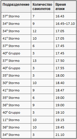 После того как завершился артиллерийский бой, появились-таки долгожданные итальянские ВВС. Их основные базы в этом районе располагалась в районе Катании и других сицилийских городов. Здесь дислоцировался штаб II воздушной эскадры, командование которой располагало примерно 14 эскадрильями бомбардировщиков, и еще 5 эскадрилий имелись в резерве. В Пулье находился штаб IV округа, который также располагал некоторым числом самолетов. Однако только к 15.05 Супермарина сумела договориться с Супераэрео, хотя Кампиони давно требовал присылки самолетов. Первая эскадрилья поднялась в воздух с авиабазы Джела на юго-востоке Сицилии в 15.35. Вслед за ней стартовали остальные самолеты Реджиа Аэронаутика и морской авиации с баз в Лечче и Бриндизи. Они проводили атаки в следующем порядке: