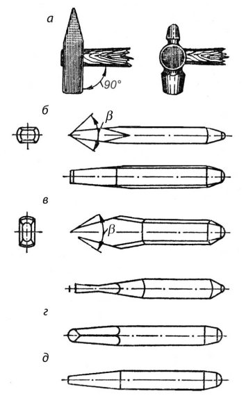 а – молотки, б – зубила, в, г – крейцмейсели, д – бородок