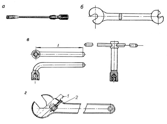 Рис. 8. Отвертка (а) и гаечные ключи (б, в, г)
