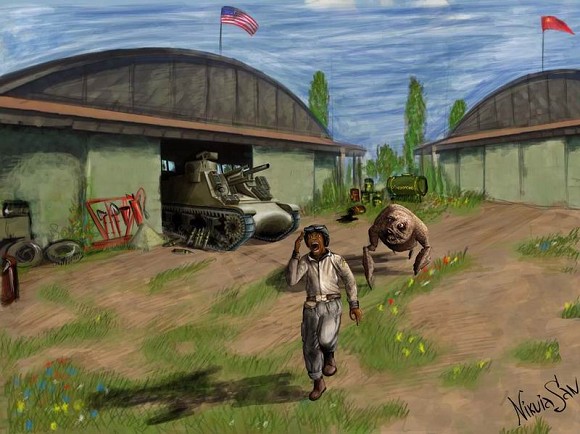 Сбежались экипажи из всех трех казарм. Первыми успели русские, во главе с комиссаром. Он-то и оприходовал напавшую на мехвода с американской арты М7 невиданную тварь — сорвал с креплений на броне стоявшего рядом КВ-220 лом и от души влепил чудищу промеж глаз.