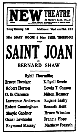 В Лондоне пьеса была поставлена тремя месяцами позже, 26 марта 1924 года, а затем прочно вошла в репертуар английских театров наряду с шекспировскими пьесами. Трайбич, немецкий переводчик пьесы, писал в своей «Хронике жизни», что премьера этой пьесы в Берлинском театре увенчалась «величайшим театральным успехом, какой ему только приходилось видеть». Во время московских гастролей театра «Олд Вик» в 1962 году «Святая Иоанна», показанная вместе с шекспировскими драмами, пользовалась большим успехом у русских зрителей.