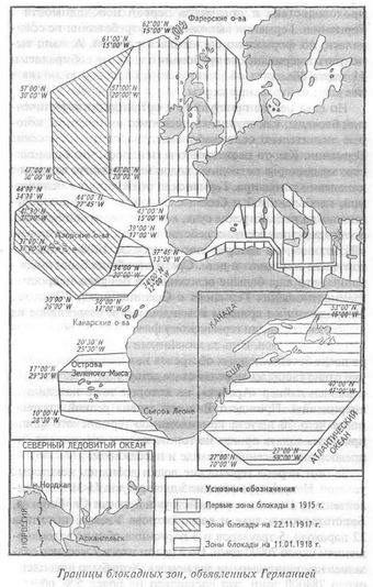 Расстояние между линиями было выбрано так, что, если торговое судно проходило одну линию ночью, то вторую ему пришлось бы пересечь днем. Система блокады в начале 1915 года показана на схеме. В апреле 1916 года англичане начали держать 2 корабля в районе севернее Исландии. Блокадная деятельность 10-й эскадры крейсеров продолжалась до 1917 года, когда была введена система конвоев для нейтральных судов. Германских судов в океане просто не осталось, а после вступления в войну Соединенных Штатов Германия потеряла последнюю возможность импорта. Еще в 1916 году были организованы рейсы торговых подводных лодок, которые могли прорвать британскую блокаду, но эти походы имели больше пропагандистское значение.