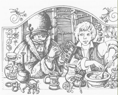 Но Марту лень возражать, потому что толку от этого всё равно не будет. Кроме того, мастер тут же велит снова достать с полки пчелиную пыльцу. И на этот раз работа некоторое время идет весьма успешно. Март сыплет на весы, как велит мастер, пчелиную пыльцу, и молотую акулью чешую, и козлиную кровь в порошке. И мастер отвешивает нужные дозы, высыпает их на каменное блюдо среднего размера и смешивает.