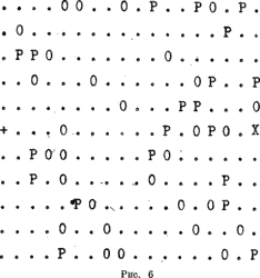 Рисунок 6 воспроизводит экран микрокомпьютера. Помещение есть прямоугольник с 11 строками и 18 столбцами. Строки обозначают свободные места, 0 — расщелины в полу, Р — роботы. Крестик (x) обозначает игрока, здесь — в начальном положении. Выход обозначен плюсом.