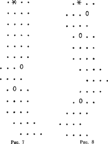 Предположим сначала, что вы не меняете направления движения. Ваша машина спускается по вертикали на число строк, равное вашей скорости. Это может привести к тому, что вы пересечете поле, обозначенное 0. Тогда вы сталкиваетесь с грузовиком, вы пропали. Это может также привести вас к тому, что вы попадаете на не обозначенное поле. Вы покинули дорогу. Это — тяжелый несчастный случай. Вы пропали. Так, на рис. 8, если ваша скорость превосходит 2, то вы сталкиваетесь с грузовиком. Если бы вы исходили из крайнего левого поля того же ряда и ваша скорость превосходила бы 5, то вы покинули бы дорогу (внимание: вы пропали с того момента, как вы достигли нуля или не обозначенного поля. Оставшаяся часть вашей траектории движения не рассматривается).