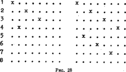 На рис. 28 представлены две попытки решения. На левой доске поставлены 4 ферзя. Все поля строки 6 ими уже блокированы. Продолжать дальше бесполезно. На правой доске мы сумели поставить 7 ферзей, но восьмая строка блокирована.