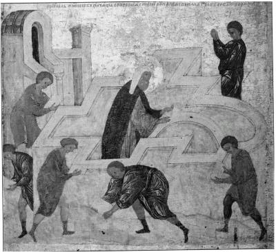 Митрополит Петр закладывает Успенский собор в Московском Кремле. Клеймо иконы «Митрополит Петр с житием». Конец XV в.