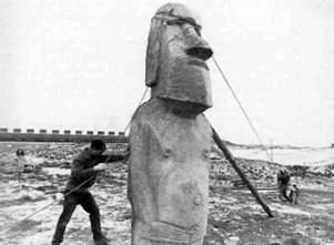 Чешский инженер Павел Павел, воспоминания которого мы помещаем в этой книге, провел важные эксперименты с девятитонной моделью моаи. Она была положена спиной вниз на сани, стоявшие на траве, но тридцать мужчин не смогли сдвинуть ее.
