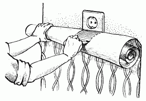 Если же наклеиванием обоев заняты двое, то в таком случае нет нужды периодически спускаться с табурета (или со стремянки, если в комнате очень высокие потолки). Человек, работающий внизу, промазывает обои, складывает их и подает своему напарнику, который занят непосредственно оклейкой стен. Он же берет сложенное полотнище обоев за один край и, поднеся к стене, постепенно опускает его. Таким образом полотнище выпрямляется.
