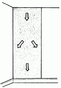 Процесс наклеивания обоев происходит в следующем порядке: взяв сложенное полотнище за края, отгибают его верхнюю часть и прикладывают к верхней горизонтали того угла стены, от которого предполагается начать оклеивание. С помощью отвеса определяют строго вертикальную линию, по которой должно быть выровнено первое полотнище (рис. 7). Если стены в помещении недостаточно ровные, желательно наметить эту вертикальную черту карандашом, проведя им вдоль линии отвеса.