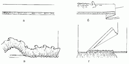 Рис. 44. Последовательность изготовления оборки с подкладкой, оформленной руликом: а – стачивание основной и подкладочной деталей; б – припосаживание всей оборки; в – приметывание оборки к ткани основной детали; г – притачивание оборки к изделию между основной деталью и подкладкой.