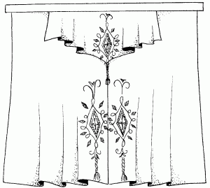 Точно так же выкраивают изделие, изображенное на рисунке 68. Оно состоит из двух полотнищ со скошенными краями, наложенными друг на друга. Нижние срезы оформляют краевой ажурной вышивкой с чередующимися по ширине фестонами, лепестками, дополненными насыпью, или выпуклыми шишечками.