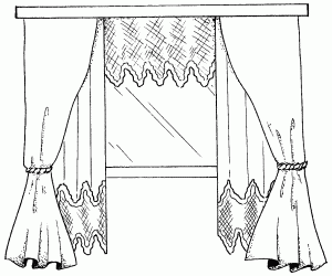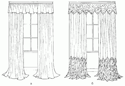 Рис. 65. Драпировка окна гостиной: а – с использованием мелкомасштабного гардинного полотна; б – с использованием гардинного полотна с каймой.