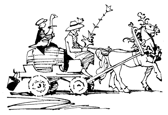 Между тем выезд, на который стоило посмотреть, превратился в выезд, на который невозможно было досыта насмотреться. Прощаясь, Ученый Садовод украсил Старую Лошадь розами, и теперь она стала похожа на пряничного доброго льва, которого хотелось съесть, — так она была мила и красива. В шляпе Лекаря-Аптекаря тоже торчала роза, но бледно-желтая, чайная, называющаяся так потому, что она была привезена из Китая. А китайский чай, как известно, так хорош, что его пьют без сахара — во всяком случае, сами китайцы. Петька, который, как все мальчишки, презирал цветы, все-таки обвил водовозную бочку цветущим голубым плющом и приколол к своей курточке несколько анютиных глазок. Словом, выезд утопал в цветах, и было бы очень хорошо, если бы пассажиры (или хотя бы Лошадь) знали, куда они едут.