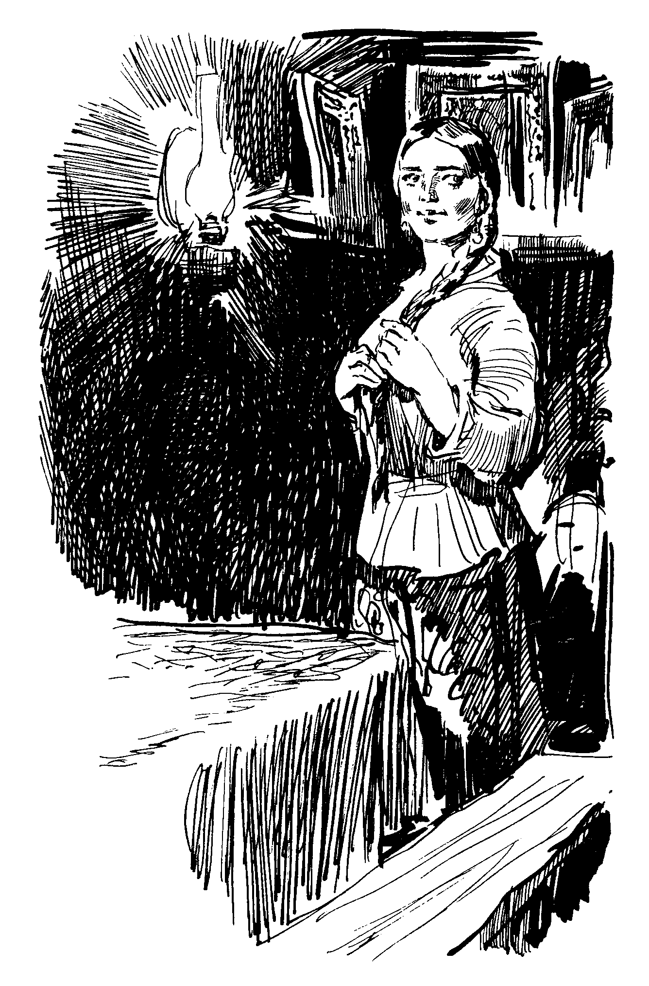 Женщина прошла из сеней в избу, зажгла на стене жестяную лампу. И теперь мы увидели, что она действительно молодая, красивая, с высокой грудью, с плавными движениями.