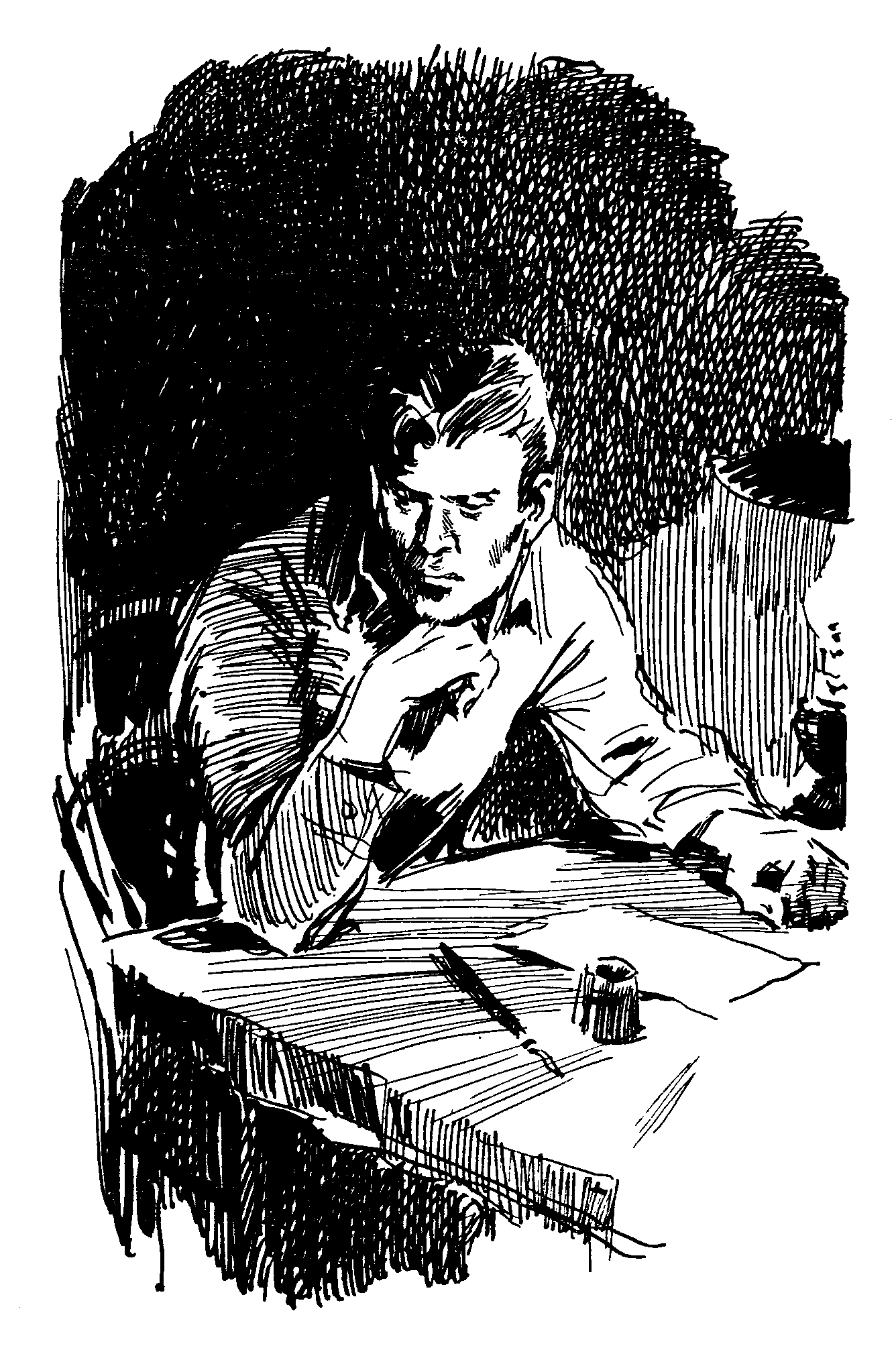 Он зажег лампу и сел к столу, подперев щеку ладонью, будто у него вдруг заболели зубы.