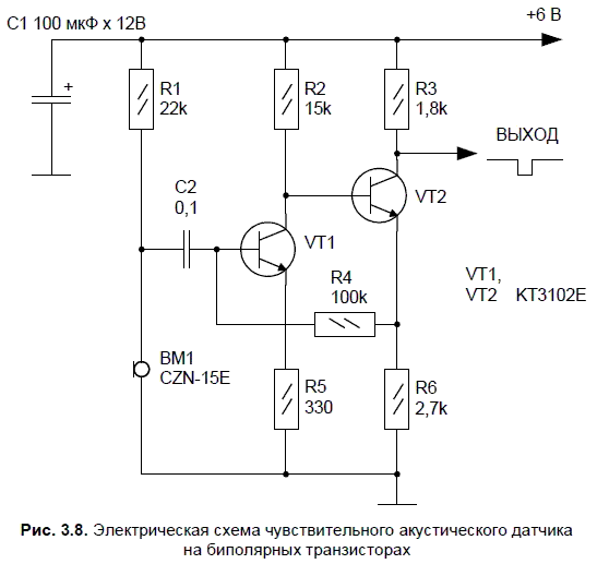 На рис. 3.8 представлено устройство усилителя слабых сигналов. Устройство реализовано на двух однотипных кремниевых транзисторах n-p-n проводимости, обладающих высоким коэффициентом усиления (80—100 по току). При звуковом воздействии на микрофон ВМ1 переменный сигнал поступает в базу транзистора VT1 и усиливается им. С коллектора транзистора VT2 снимается выходной сигнал, управляющий периферийными или исполнительными устройствами отрицательным фронтом.