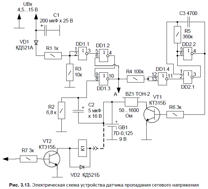 Рассмотрим простое в построении устройство датчика отключения электроэнергии со звуковым сигнализатором состояния, электрическая схема которого представлена на рис. 3.13.