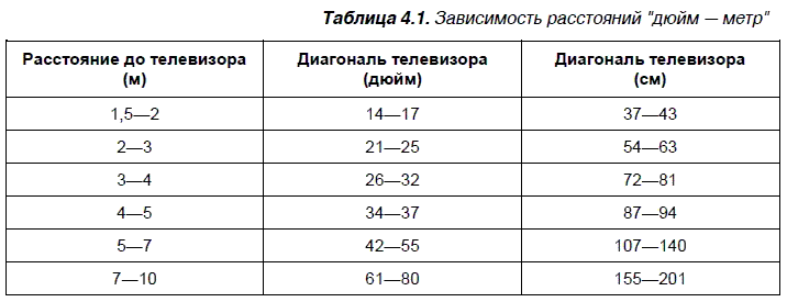 Как правило, диагональ телевизора измеряется в дюймах, а расстояние — в метрах. В табл. 4.1 рассмотрены соответствия «дюйм — метр».