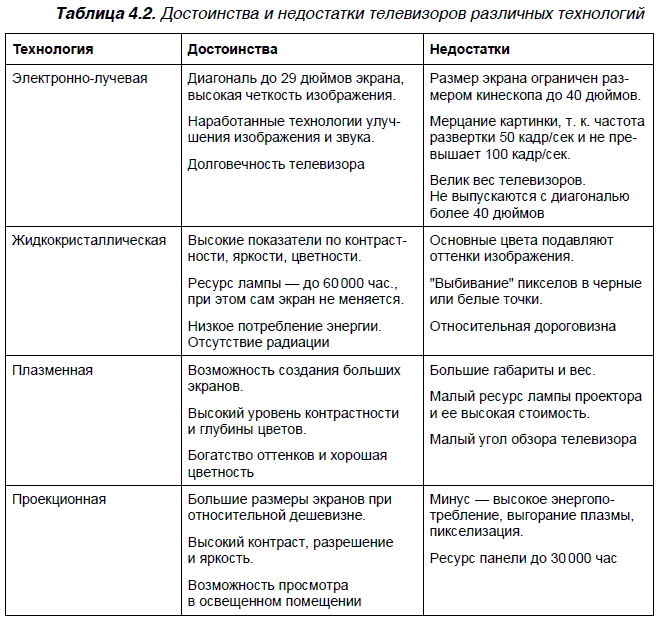 Далее рассмотрим достоинства и недостатки телевизоров различных технологий, которые сведены в табл. 4.2.