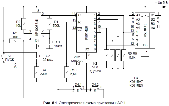 На рис. 5.1 предлагается простая приставка к АОН, автоматически запускающая тот или иной режим «интеллектуального» телефона, после подачи управляющего цифрового импульса (от кнопки или другого устройства) с положительным фронтом в точку А схемы.