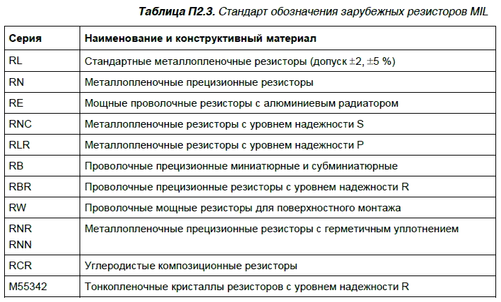 Шестой элемент — буквенный код, которым обозначается уровень надежности резисторов в течение 1000 час. Для пояснения этого параметра обратите внимание на табл. П2.4.