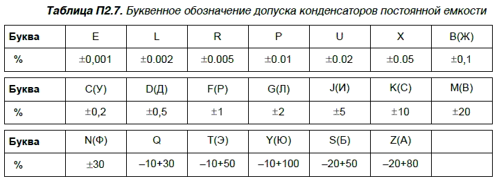 Конденсаторы, как и постоянные резисторы, разделяются по группам допуска отклонения от номинальной емкости. Эти данные сведены в табл. П2.7. В табл. П2.8 представлены данные буквенного обозначения напряжения (маркировки) на конденсаторах.