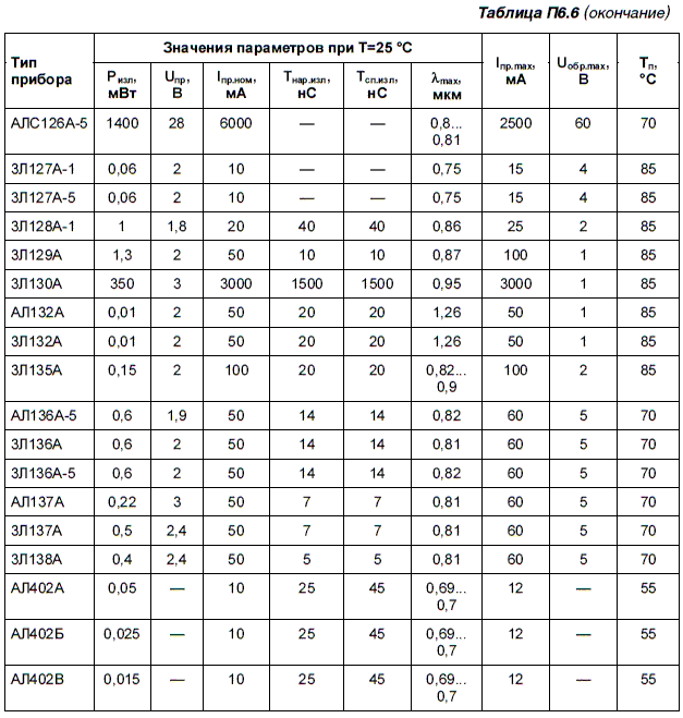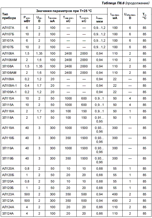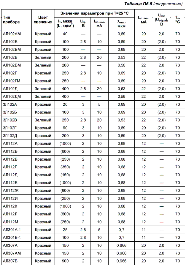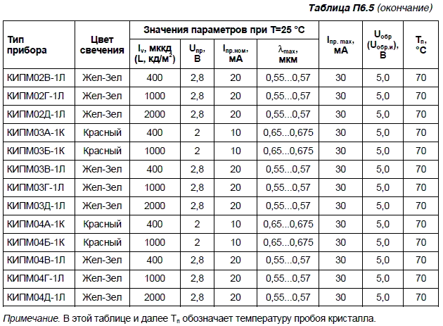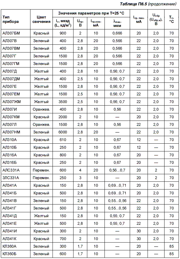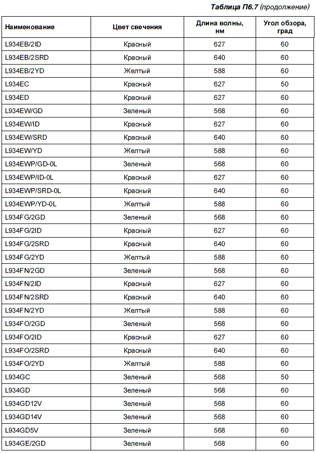 Благодаря современной технологии и уникальной конструкции, светодиоды, приведенные в табл. 6.1, имеют возможность работать в температурной диапазоне -65…+85 °C при том, что их зарубежные аналоги по электрическим характеристикам выдерживают лишь температурный диапазон -30…+60 °C.
