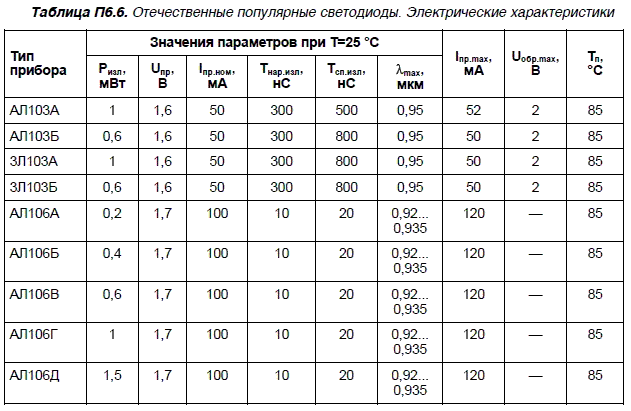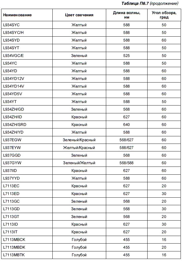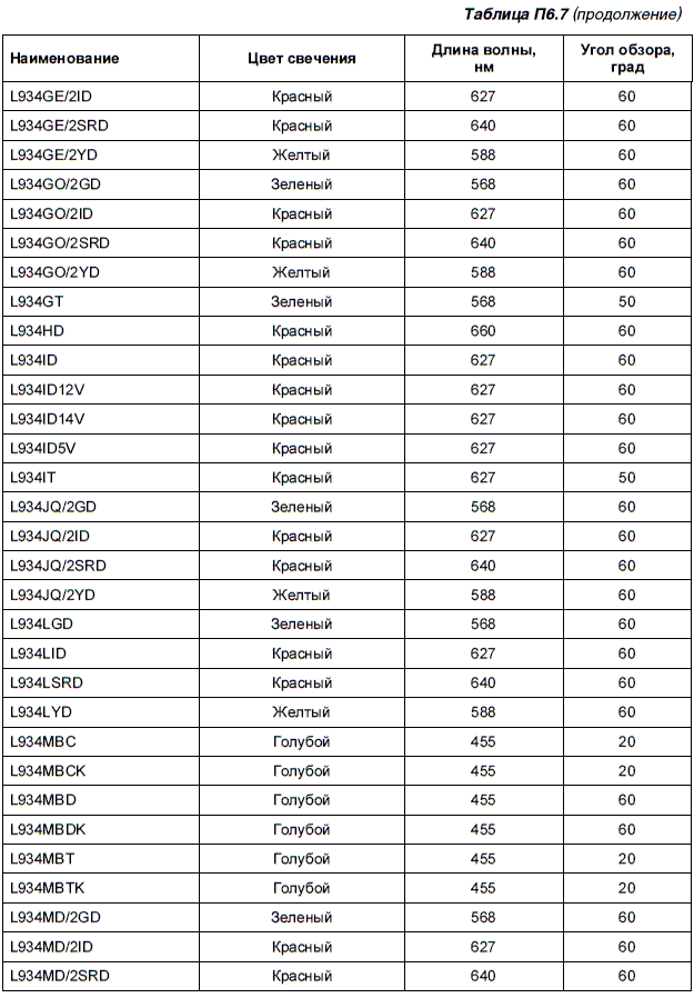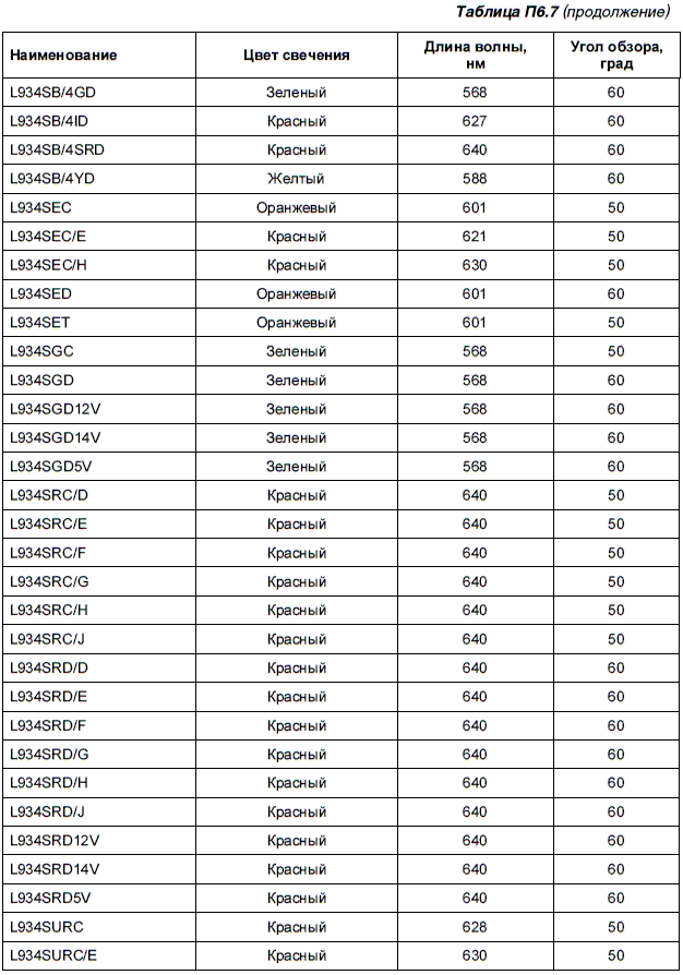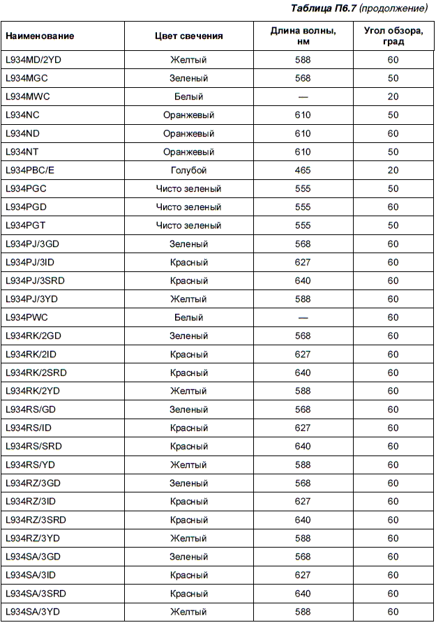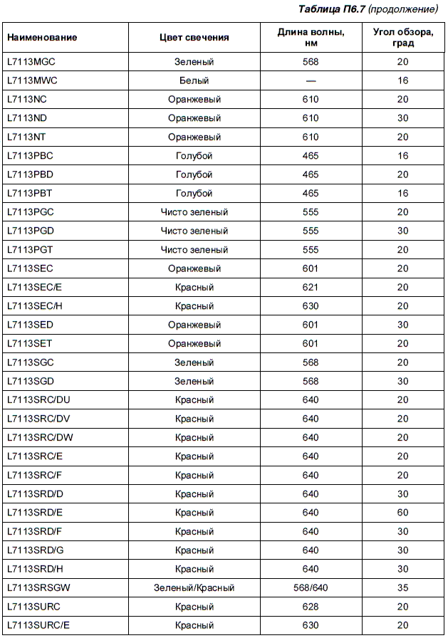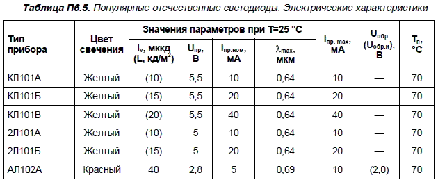 Наиболее популярные сверхъяркие светодиоды рассмотрены в табл. П6.1.