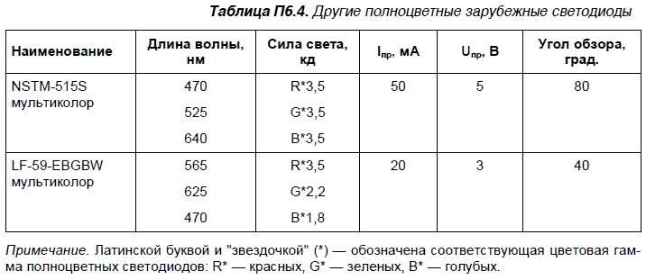 Кроме того, популярные полноцветные светодиоды представлены в табл. П6.4.