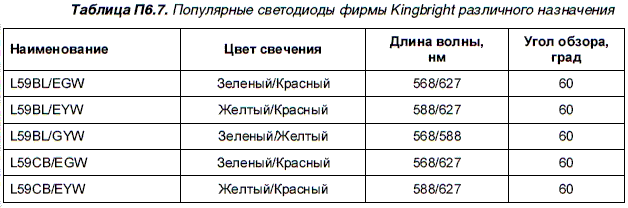 Наряду с отечественными производителями светодиодов в продаже уже давно появились светодиоды зарубежного производства, как ни странно имеющие наименьшую стоимость по сравнению с отечественными светодиодами. Популярные отечественные светодиоды представлены в табл. П6.5 и П6.6. Зарубежные светодиоды, на примере производства фирмы Kingbright сведены в табл. П6.7. Туда же помещены актуальные справочные данные по двухцветным светодиодам той же фирмы.