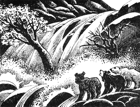 От этого камня было лапой подать до дерева, торчавшего прямо из пенящейся воды. Для черной медведицы, привыкшей лазить по деревьям, этот этап казался наиболее простым. Если это дерево выдерживает бешенство водопада, то должно и медведя выдержать! Главное не поскользнуться, спрыгивая с мокрого камня, ведь если неудачно оттолкнуться, то можно не допрыгнуть до дерева, упасть в водопад и полететь вниз.