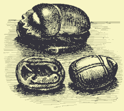А на другом рисунке — древнеегипетские каменные скарабеи из коллекций Эрмитажа. С брюшной стороны жуков вырезаны иероглифы текстов для оттиска их на важных документах: священный скарабей превратился в печать…