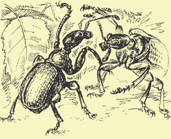 Из куколок выходили жуки. Чем их кормить? Будут ли в неволе размножаться? Поставил в садок веточку березы. Увы, делать домики они не стали, зато, кормясь, прогрызали в листьях множество маленьких дырочек. Брачных симпатий друг к другу не проявлялось, наоборот: начались… драки. Два жука, встретившись лицом к лицу, высоко подняв туловище на своих черноблестящих суставчатых ногах, махали передними, как руками, били друг друга, но неуклюже, «непрофессионально»…