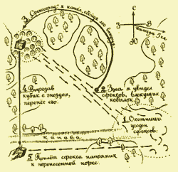 Выходило, что сфекс, находясь где-то на долгой и пока еще безуспешной охоте за кобылками этого редкого вида, как-то почуял, что с норкой творится что-то недоброе, и немедленно прилетел к ней напрямик. Именно напрямик, а не на старое место — я хорошо помню, что видел: он летел ко мне на высоте примерно двух метров именно с восточной стороны, то есть оттуда, где за колками были охотничьи угодья сфексов, а не от «лункограда», находившегося теперь от меня и монолита с гнездом прямо на севере. Схема поможет вам понять и представить всю необычность и таинственность происходившего.